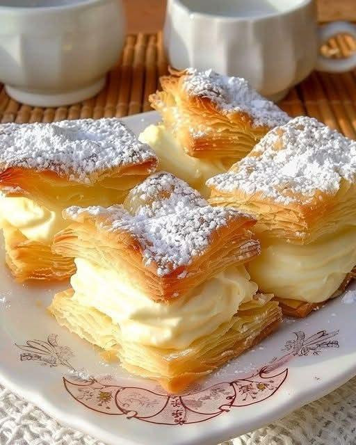 1. So geht es, Zuerst den gekauften Blätterteig in Quadrate schneiden und im vorgeheizten Backofen ca. 15 Minuten bei 180 °C backen. Dann etwas auskühlen lassen.Danach In der Mitte durchschneiden.