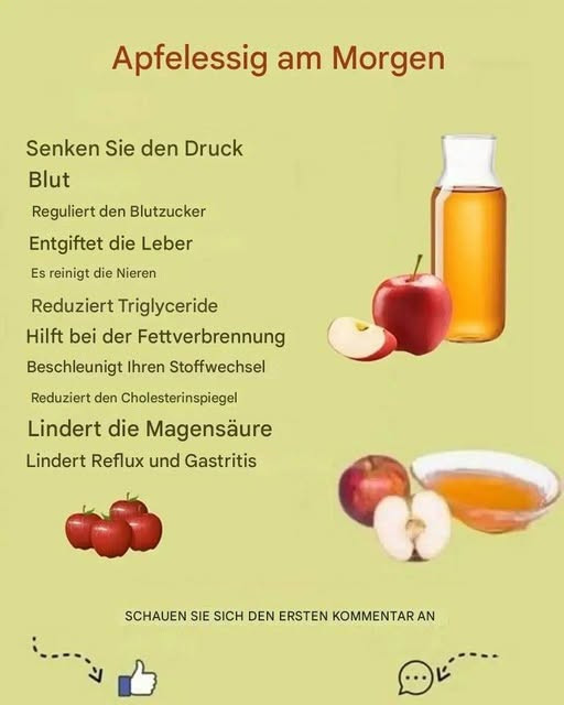 Immer mehr Menschen beginnen ihren Tag mit einer einfachen Geste: einem Glas warmem Wasser mit Apfelessig. Doch was passiert wirklich mit Ihrem Körper, wenn Sie dieses natürliche Heilmittel jeden Morgen einnehmen? Apfelessig ist reich an wohltuenden Inhaltsstoffen und kann die Verdauung verbessern, den Stoffwechsel anregen und das Immunsystem stärken. In diesem Artikel erkläre ich Ihnen Schritt für Schritt, wie Sie Apfelessig morgens richtig zubereiten und einnehmen. Außerdem verrate ich Ihnen nützliche Tipps und interessante Variationen, um ihn an Ihren täglichen Bedarf anzupassen.