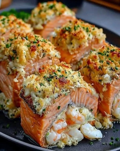 A luxurious seafood dish where tender salmon is stuffed with a rich, creamy crab and shrimp filling—perfect for a special dinner!