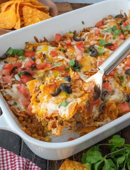 Dieser Dorito-Auflauf vereint alle lebendigen, pikanten Aromen Ihrer Lieblingsgerichte aus Tex-Mex mit dem unwiderstehlichen Knuspern der Doritos zu einem unglaublich sättigenden Gebäck. Schichten aus gewürztem Rinderhackfleisch, pikanter Salsa, cremiger Sauerrahm, Mais, schwarzen Bohnen und geschmolzenem Käse, alles gespickt mit zerkleinerten Nacho Cheese Doritos, ergeben eine unterhaltsame und familienfreundliche Mahlzeit voller Geschmack und Textur.