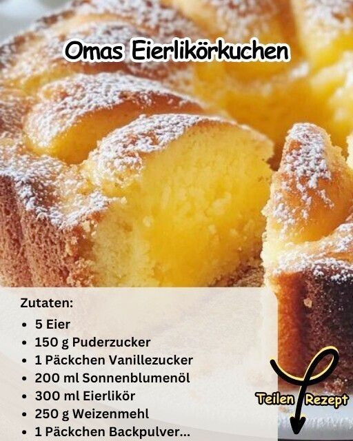 Eierlikör Kuchen aus Omas Zeiten. Eierlikörkuchen mit gelinggarantieZutaten5 Eier150 g Puderzucker1 Pck. Vanillezucker200 ml Sonnenblumenöl300 ml Eierlikör250 g Weizenmehl1 Pack. BackpulverZubereitungDas Rezept wird auf der nächsten Seite fortgesetzADVERTISEMENT Next→