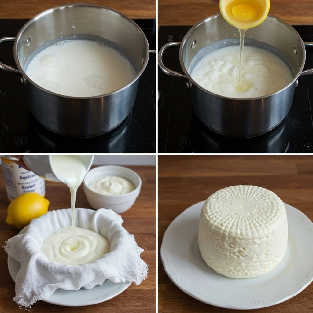Selbstgemachter Hüttenkäse wird aus einem Liter Milch, einer halben Zitrone und einem Joghurt hergestellt.