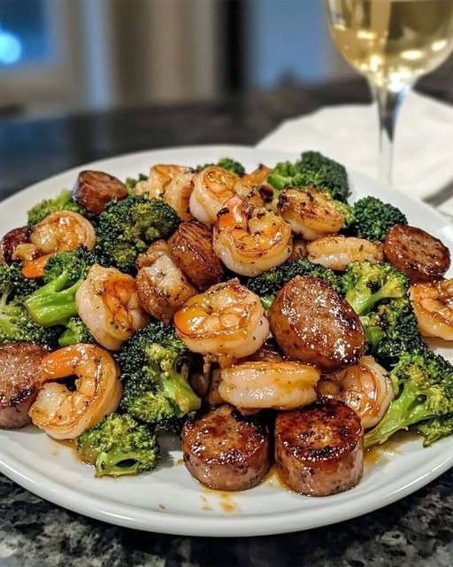 Honig-Knoblauch-Garnelen, Wurst und Brokkoli