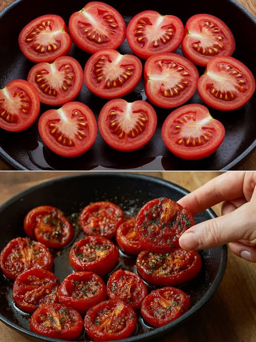 Ich backe sie nicht mehr im Ofen: Da ich sie so in der Pfanne brate, verschwinden die gerösteten Tomaten im Nu. Geröstete Tomaten