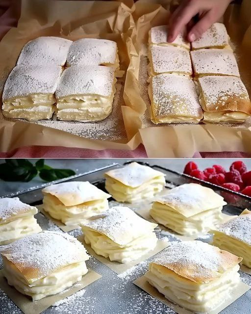 300 ml SchlagsahneSo meine lieben Zuerst den gekauften Blätterteig in Quadrate schneiden. Dann im vorgeheizten Backofen ca. 15 Minuten bei 180 °C backen. Dann etwas auskühlen lassen.