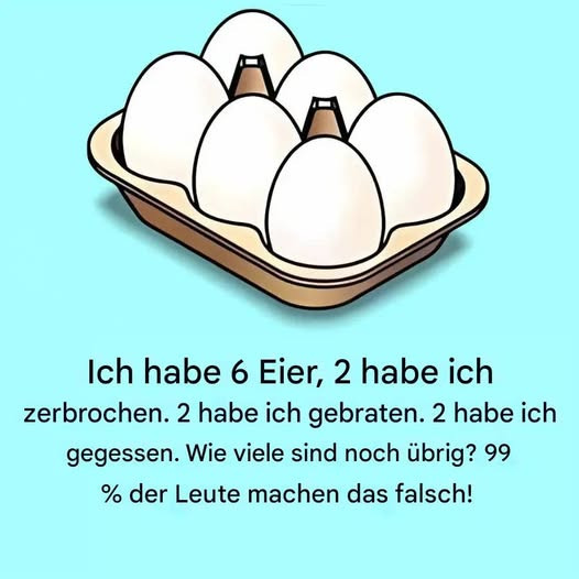 Stell dir vor, du stehst vor 6 Eiern. Wie viele sind nach der Verwendung von 2 wirklich übrig? Ein einfaches Rätsel, das eine überraschende Antwort bereithält…