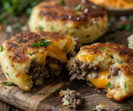 Genießen Sie den herzhaften Geschmack von deftigen Kartoffeln, würzigem Hackfleisch und geschmolzenem Cheddar-  Käse  in diesen  gefüllten  Kartoffelpuffern mit Käse-Rindfleisch-  Füllung . Dieses köstliche Gericht kombiniert Kartoffelpüree mit einer aromatischen Hackfleisch-Käse-Mischung zu knusprigen, goldbraunen Puffern, die Ihre Gelüste garantiert stillen. Ob als Beilage oder Hauptgericht – diese Kartoffelpuffer sind einfach zuzubereiten und stecken voller unwiderstehlicher Aromen. Folgen Sie diesem einfachen Rezept und zaubern Sie einen Publikumsliebling, von dem alle Nachschlag wollen!
