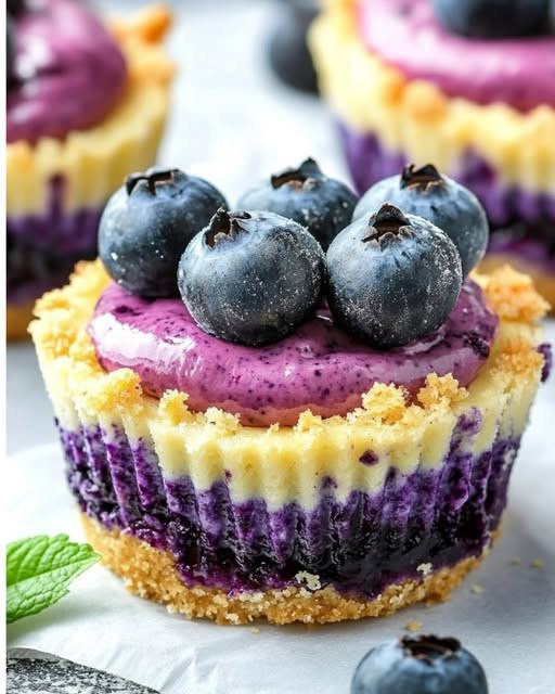 Diese Mini Heidelbeer-Käsekuchen sind ein köstliches Dessert mit einem Boden aus Graham Crackern, cremiger Käsekuchenfüllung, selbstgemachter Heidelbeerfüllung und einem knusprigen Streusel-Topping. Perfekt für jeden Anlass, sind diese mundgerechten Desserts genauso lecker wie bezaubernd!