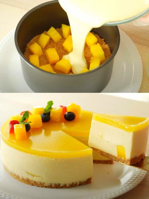 Die Mango-Gelatine-Mischung auf den festgewordenen Käsekuchen geben und nochmals für etwa 1 Stunde kühl stellen.