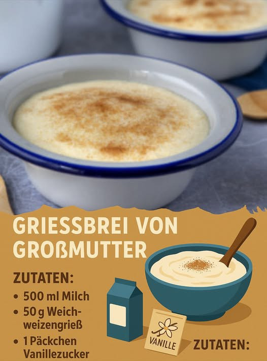 Du brauchst: 900 ml Milch, 2 EL Zucker, 1 Päckchen Vanillezucker, 120 g Weichweizengrieß, 1 Prise Salz, 1 Ei, 35 g Butter.
