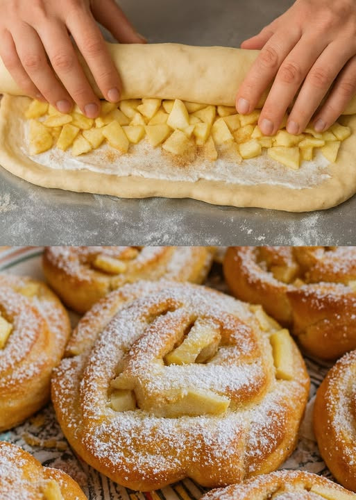 𝙕𝙪𝙩𝙖𝙩𝙚𝙣: Für den Teig 3 EL Naturjoghurt 80 g Zucker 1 Ei 200 g Butter 170 ml Milch etwas Salz 1 Würfel frische Hefe 1 PackungBackpulver 650 g Mehl Für den Belag 130 g Butter 4 Äpfel 1 Packung Vanillezucker Für die Dekoration Nach Belieben Zucker Nächste