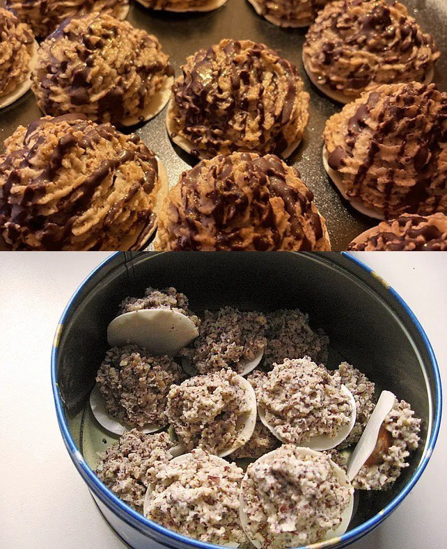 Zutaten 1 Eiweiß 30 g Zucker 1 Prise(n) Salz 75 g Haselnüsse, gemahlen 1 Pck. Konfekt (Toffifee, 15 Stück) 15 Oblaten (50 mm) Zubereitung siehe Fortsetzung auf der nächsten Seite