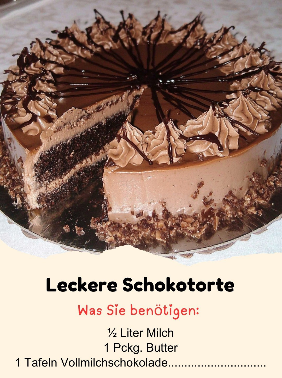 Zutaten: ½ Liter Milch 1 Pckg. Butter 1 Tafeln Vollmilchschokolade 1 Tafeln Zartbitterschokolade 1 Wiener Boden Zubereitung: Das Rezept wird auf der nächsten Seite fortgesetz ADVERTISEMENT