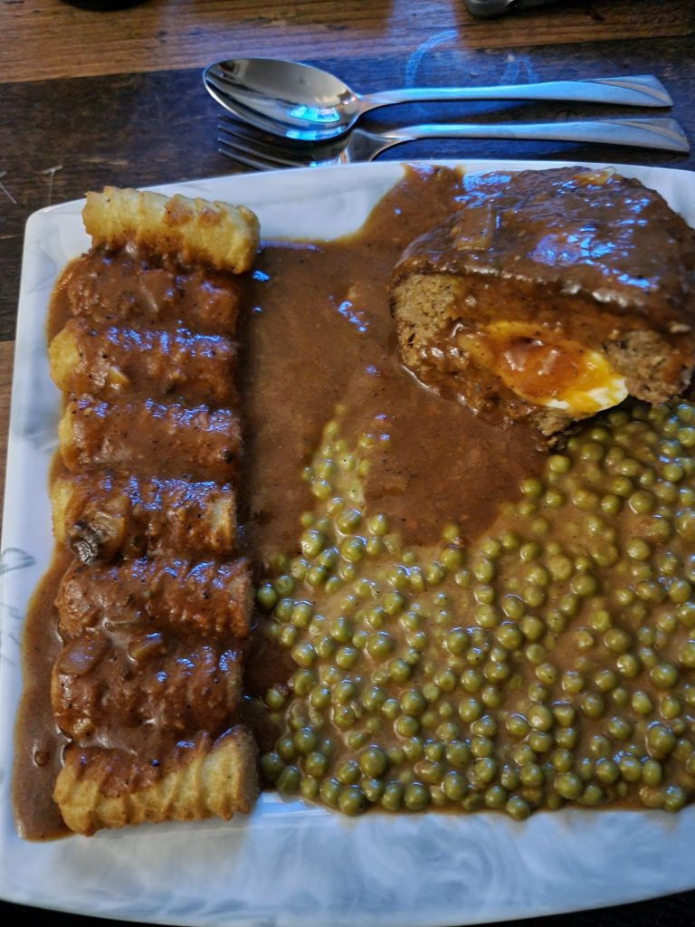 🍽️ Hackbraten mit Ei, Kroketten & Erbsen – Rezept