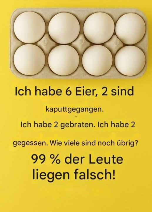 Manchmal sind es nicht die komplizierten mathematischen Gleichungen oder wissenschaftlichen Fragen, die uns aus dem Konzept bringen – sondern die ganz einfachen Aufgaben, die unser logisches Denken herausfordern. Genau so ein Fall ist dieses Rätsel mit sechs Eiern, das derzeit in sozialen Medien für Aufsehen sorgt. Auf den ersten Blick scheint die Frage kinderleicht. Doch während viele spontan antworten, zeigt sich schnell: Die Mehrheit liegt falsch. Warum? Weil wir oft zu schnell urteilen, statt genau zu lesen