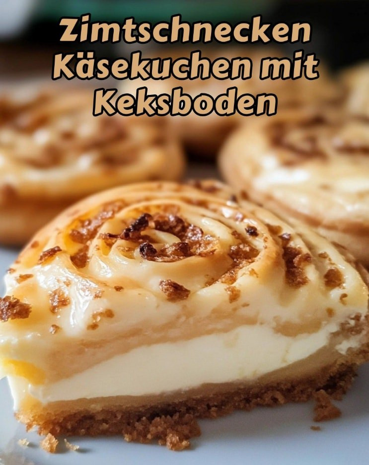 Ein cremiger Käsekuchen mit Zimtschnecken-Geschmack auf knusprigem Keksboden, perfekt für alle Zimtfans!